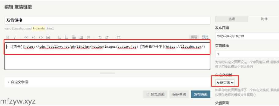 主题中实现了一个友情链接页面模板,可在添加友情链接独立页面