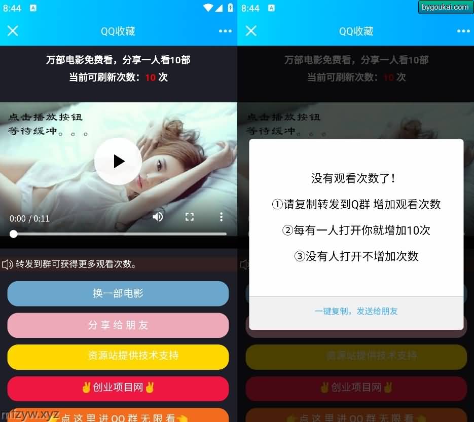 用户达到观看次数后需要分享给好友或者群,好友必须点击推广链接后才会增加观看次数。