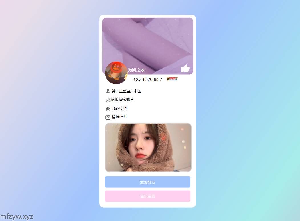 免费资源网网站源码2024-08-16 【网站源码】超漂亮的个人主页仿QQ资料单页HTML 源码由HTML+CSS+JS组成,记事本打开源码文件可以进行内容文字之类的修改,上传到服务器里面即可 【搭建教程】1.源码上传至虚拟机或者服务器 2.绑定域名和目录 3.访问域名安装, 4.安装完成后就行了 好看的个人仿QQ单页HTML[mfzyw.xyz免费资源网].7z https://www.123pan.com/s/ATShTd-EwzQH 本站所有课程资源均为用户上传,如有侵权,请联系邮箱提供相应材料,我们会尽快删除免费资源网 » 【网站源码】超漂亮的个人主页仿QQ资料单页HTML