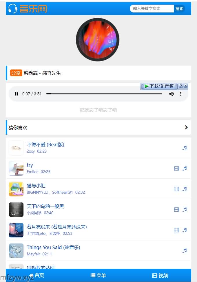 免费资源网网站源码2024-08-16 音乐网站源码 外链解析免费听音乐MP34 调用音乐API,将返回的信息进行解析,实现在线播放以及视频音频外链地址获取。 源码介绍 音乐试听外链站是 调用音乐app接口,将返回的信息进行解析获得解析地址,可实现在线播放以及调用视频及音频外链。 单php文件,免维护,居家必备 index.php —— 自适应版 音乐网站源码,外链解析免费听音乐MP34[mfzyw.xyz免费资源网].7z https://www.123pan.com/s/ATShTd-6gzQH 本站所有课程资源均为用户上传,如有侵权,请联系邮箱提供相应材料,我们会尽快删除免费资源网 » 音乐网站源码 外链解析免费听音乐MP34
