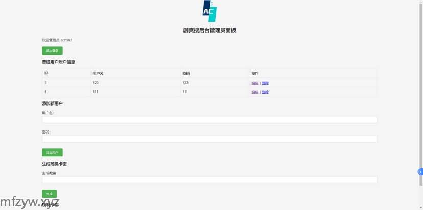 功能1:带管理员后台,可管理前端用户新增、编辑、删除等,自带卡密系统,后台可生成卡密,用于前端用户注册