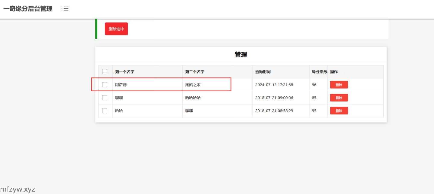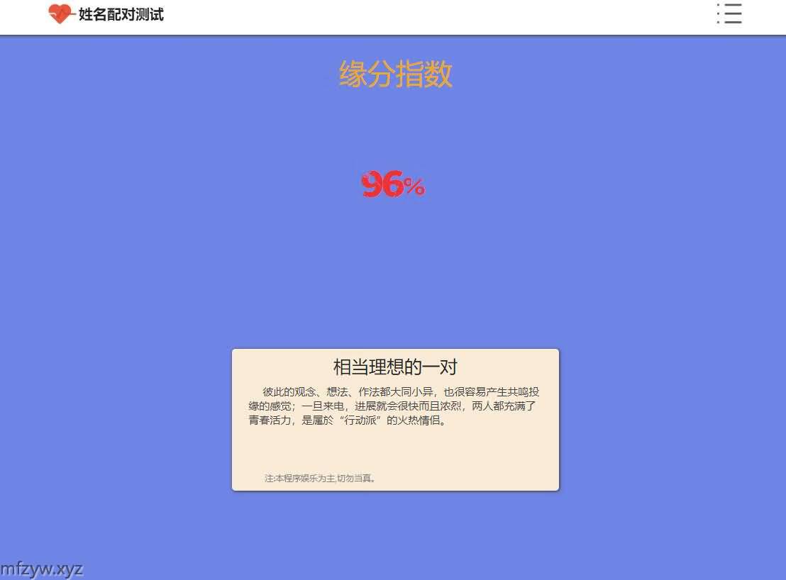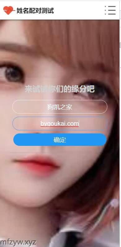 PHP姓名配对测试源码|查看好友喜欢谁趣味网站源码是一款基于PHP+MYSQL开发制作的趣味测试网站源码。可在后台提前设置好缘分,自己手动在数据库里修改数据,数据库里有就会优先查询数据库的信息,没设置的话第一次查询缘分都是非常好的 95-99,第二次查就比较差 ,所以如果要你女朋友查询你的名字觉得很好 那就得是她第一反应是查和你的缘分,如果查的是别人,那不好意思,第二个可能是你。
