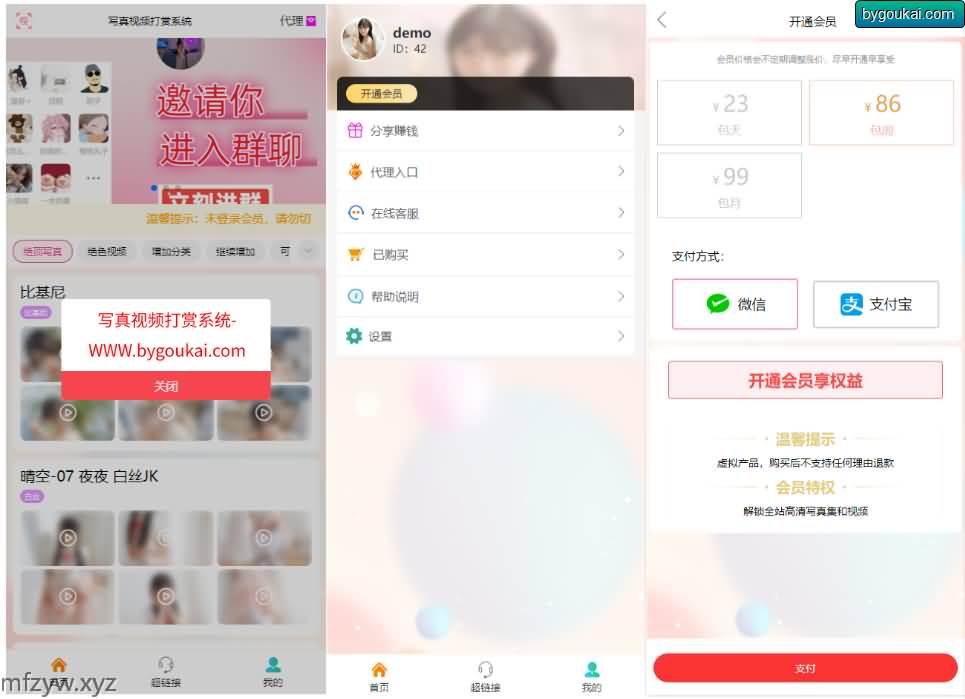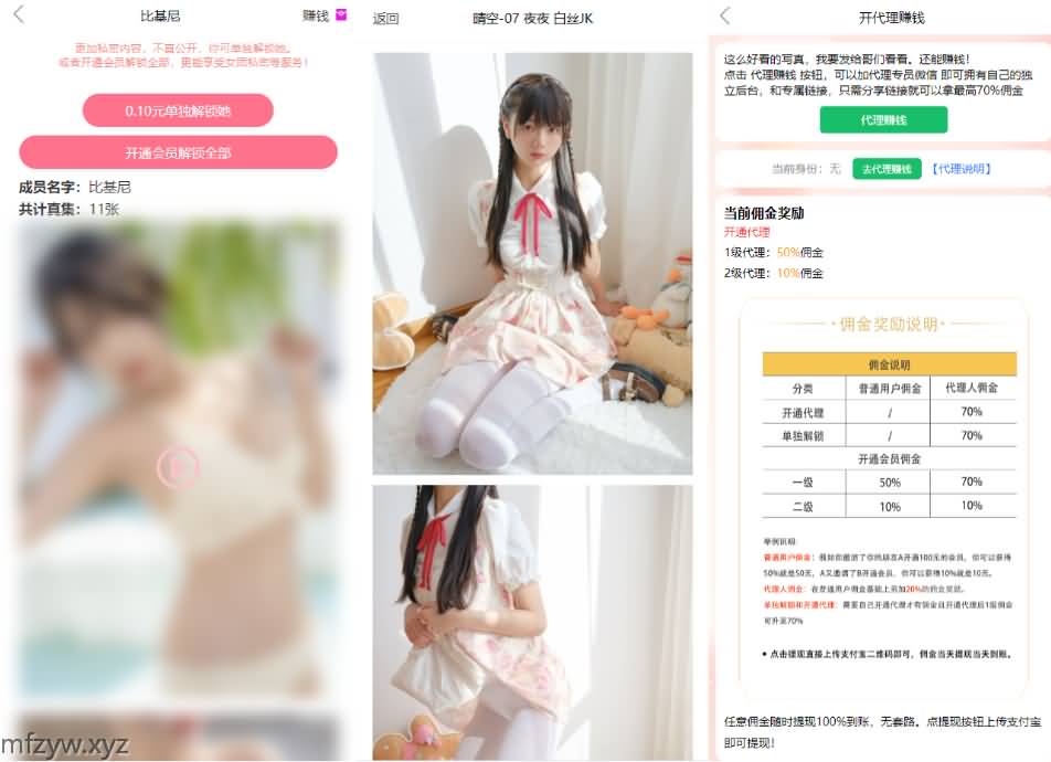这是一款开源的写真图片及视频打赏系统源码,顾名思义他可以做写真图片打赏站也可以做视频打赏站,支付对接了易支付,拥有独立代理后台,全部源码无加密,另外也可以配合付费进群使用。支付扣量、域名防洪这些基本的就不介绍了,看图吧!留给有需要的人!
