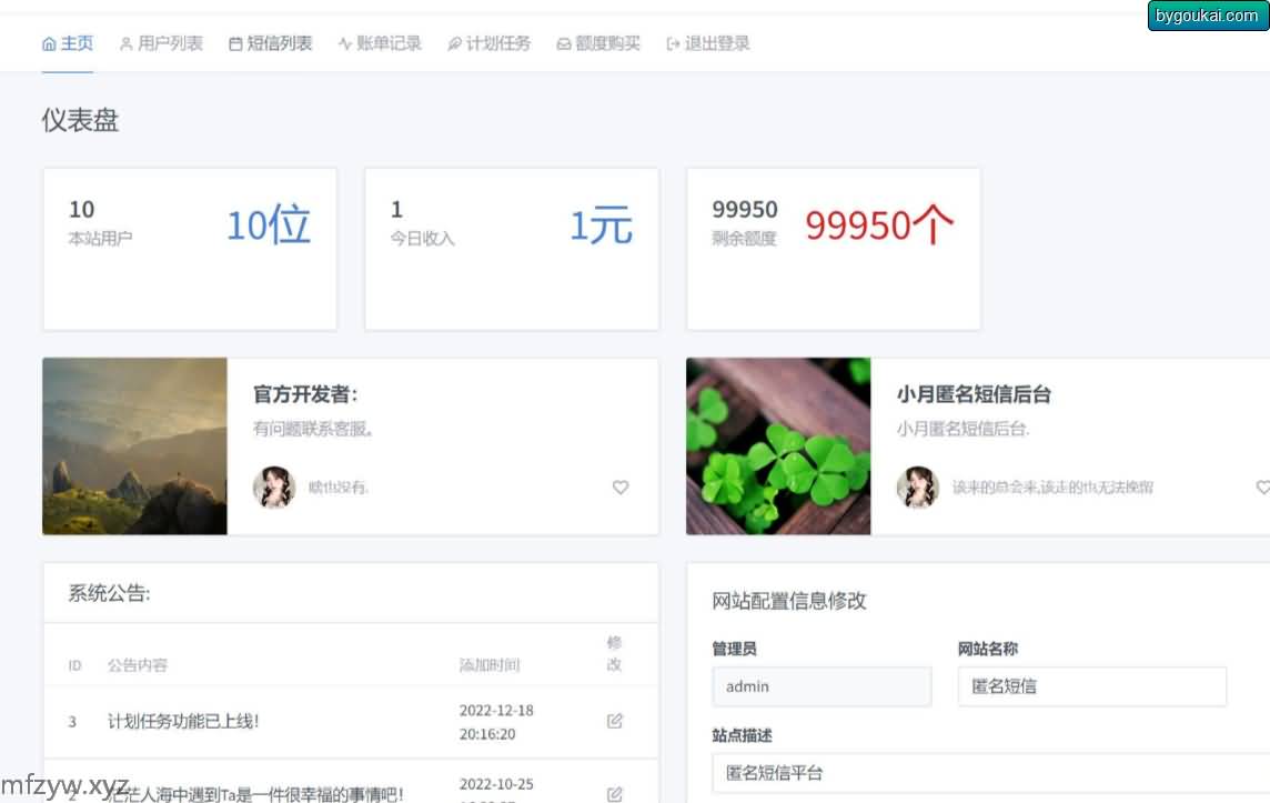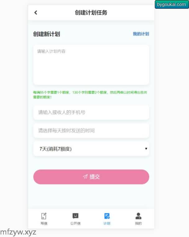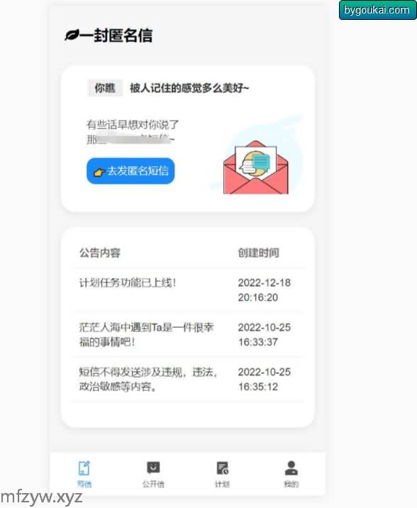 花了不少时间继续优化程序,现在2.0版本来了,优化了前端UI,新增了计划功能,程序稳定无BUG,API已给大家对接好了,程序一般用于:给TA的一封匿名信—匿名信箱,一款表白、祝福、道歉、投稿等内容信息在线传信程序。