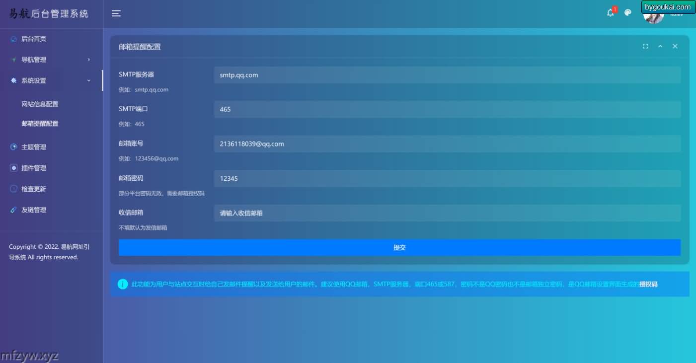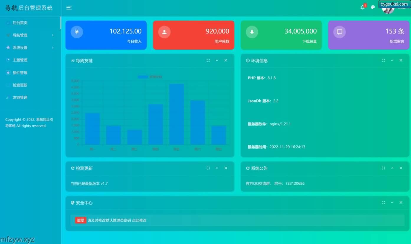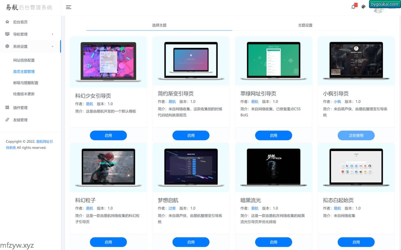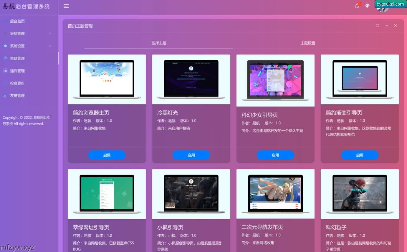综合了目前网上大多数UI漂亮的引导页面 是易航原创一款极其优雅的易航网址引导页管理系统,这虽是是一款轻量级系统,但功能繁多而不沉淀。它支持多种前台主题互换和插件化开发