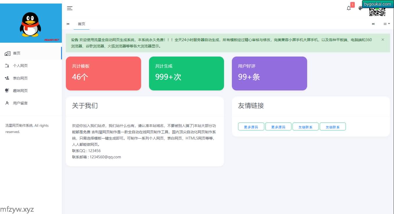 为用户使用方便考虑,全自动网页制作系统无需繁琐的注册与登入,直接选择喜欢的模板输入网页信息即可制作,并且所以模板制作不收取任何费用,无限制、免费制作所有网页。使用光年后台管理框架重构了这个系统。