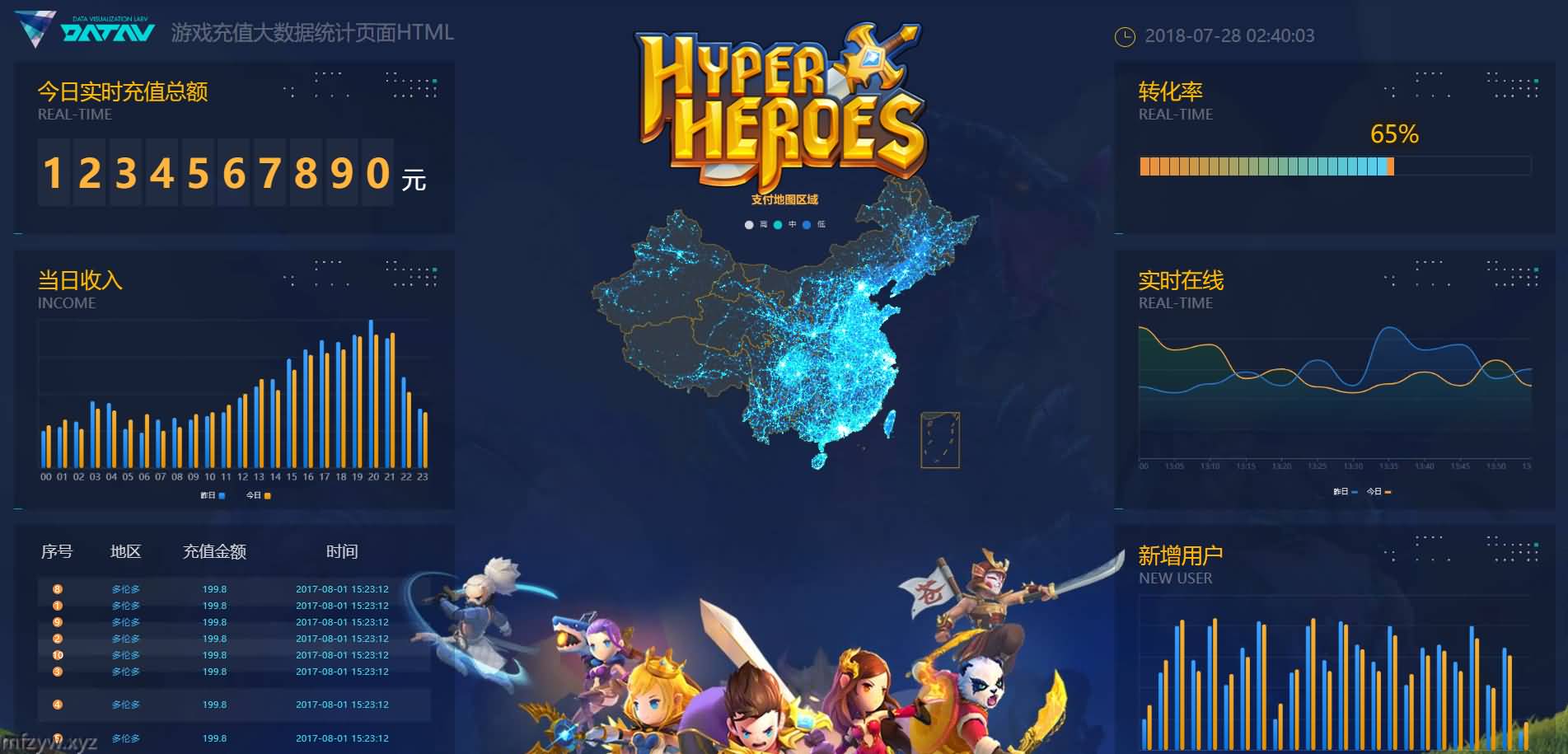 这款游戏大数据可视化界面设计清晰,有效整合了地图、角色和游戏数据。地图展示了玩家分布,实时更新的数据和图表快速呈现了活跃用户、新用户以及收入等关键指标,有助于运营者迅速掌握游戏动态,提高决策效率。整体界面简洁、科技感十足,为用户提供了良好的视觉体验。
