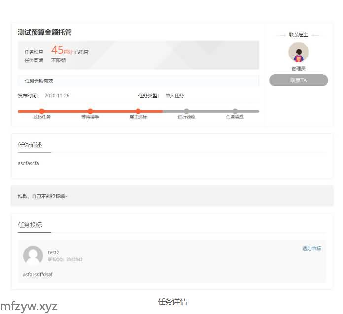 - 雇主标记任务完成,积分打到中标威客账号里,威客提现(后台可设置中标方需扣除的手续费)
