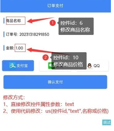 2、商品价格直接修改【pay.iyu】界面的控件id:10的文本属性(可以用us代码修改)